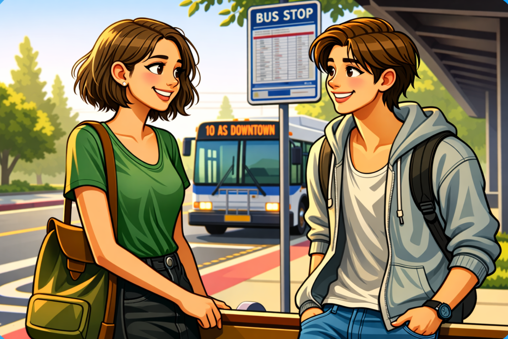 The conversation will take place between two characters, Emma and Jack. They meet each other at a bus stop, exchange very simple greetings, and say goodbye.